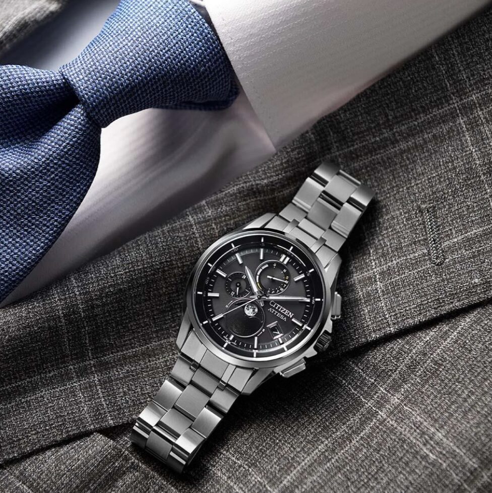 フォーマルな場面では、その洗練されたシンプルさが、スーツスタイルを格上げしてくれます。派手すぎないルナプログラムが、さりげなく個性と遊び心を主張し、品格のある印象を与えてくれます。